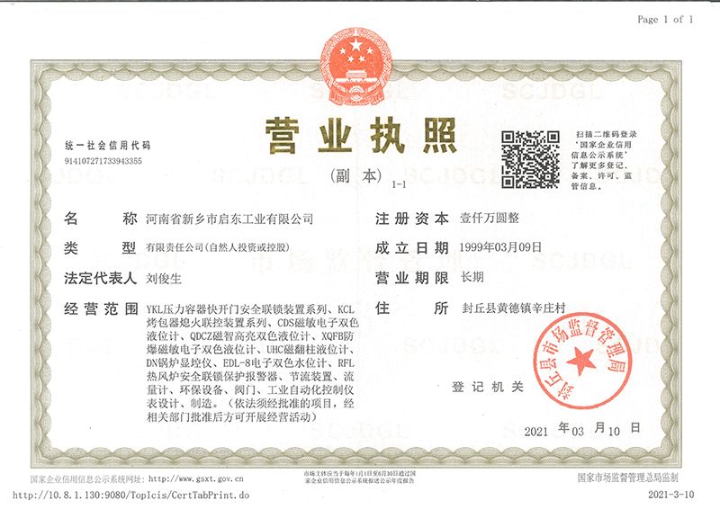 河南省新鄉(xiāng)市啟東工業(yè)有限公司始建于1987年,是專注研發(fā)、生產(chǎn)自動化儀器儀表(主要與壓力容器、鍋爐等容器配套使用)的廠家。主要產(chǎn)品有液位計(磁敏雙色型、磁翻柱型等)系列、烤包器熄火聯(lián)控裝置系列、壓力容器快開門安全聯(lián)鎖保護裝置系列、鍋爐報警器系列。二十多年來,公司產(chǎn)品暢銷國內(nèi)并遠銷俄羅斯、蒙古與東南亞,深得廣大用戶的信賴和好評。我們多年來致力于自動化儀器儀表的研制生產(chǎn),公司現(xiàn)具有完善的生產(chǎn)、試驗、檢測手段和設備。科技創(chuàng)新、誠信服務,是我們不變的經(jīng)營理念,我們將以強有力的技術支持及售后竭誠為客戶提供良好的服務?! ?012年我公司成功研發(fā)了KCL系列烤包器熄火聯(lián)控裝置,并于2013年2月2日榮獲中華人民共和國國家知識產(chǎn)權局辦法的《實用新型**證書》<**號:2021202257735>該產(chǎn)品廣泛應用于唐鋼等大型鋼鐵企業(yè),為烤包器安全作業(yè)提供了有力的保障。  2002年我公司成功研發(fā)磁敏電子雙色液位計獨特的高亮度LED紅綠雙色顯示,獲得了專家的首肯和用戶的一致好評。在此基礎上我公司研發(fā)人員十年磨一劍,致力于XQFB-1防爆型磁敏雙色液位計的研發(fā),于2013年12月27日由國家防爆電器產(chǎn)品質(zhì)量監(jiān)督檢驗中心檢驗合格并頒發(fā)防爆合格證書<編號:cnex19.0883>。該產(chǎn)品性能得到了充分的發(fā)揮,廣泛應用于含有Ⅱ類A·B級T1-T4組可燃氣體或蒸汽與空氣混合形成的爆炸性混合物的0區(qū)、1區(qū)危險場所。連接用戶DCS或PLC系統(tǒng)實現(xiàn)遠距離集中顯示和控制,從而實現(xiàn)節(jié)能、數(shù)字化管理。為用戶增加了一定的經(jīng)濟效益和社會效益,。2014年公司成功申請了夢潤儀表的logo,新的品牌新的形象,夢潤儀表是啟東的LOGO, 歡迎新老用戶前來洽談合作?! ∥覀円蝗缂韧刈⒅乜蒲械耐度?,憑借產(chǎn)品的不斷更新、加大科技含量,進一步拓展市場。我們相信品質(zhì)成就未來,以過硬質(zhì)量、優(yōu)惠價格、完善的售后服務熱忱歡迎廣大客戶來我司視察指導、洽談業(yè)務;精誠合作,共創(chuàng)輝煌!